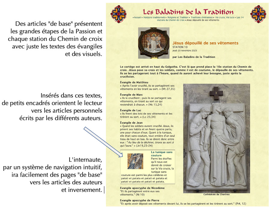 Page mise à jour le 7 mars 2026 L’esprit de cette aventure est ici : Le Chemin de croix, voie de Lumière et de Connaissance. Il s’agit donc d’écrire une soixantaine d’articles pas forcément longs, mais ils peuvent être un peu plus développés si l’inspiration s’emparait de certains auteurs. Nous souhaitons bien sûr des articles inédits à la fois culturels ET avec une touche symbolique et/ou mystique qui fait la spécificité du site des "Baladins de la Tradition". Nous pouvons nous occuper de la partie visuelle. Si vous souhaitez rédiger un ou plusieurs article(s) qui n’ont pas encore d’Auteur (c’est le cas lorsque la case Auteurs est vide), écrivez-nous pour que nous insérions votre nom ou pseudo dans la liste. Pour cela, cliquez ici, ou recopiez cette adresse : les.baladins.de.la.tradition@gmail.com Notez bien les dates limites d’envoi de vos textes par mail. A noter : sur chacun des thèmes proposés, les documents que nous avons glanés ici et là peuvent être partagés sur votre demande. Si vous souhaitez proposer d’autres thèmes, n’hésitez pas à nous contacter par mail en nous envoyant un court descriptif. Pour cela, cliquez ici, ou recopiez cette adresse : les.baladins.de.la.tradition@gmail.com Tous les rédacteurs des articles sont invités à relire la page de ce site intitulée "Aux futurs auteurs...". Vous ne souhaitez pas - ou ne pouvez pas - participer à la rédaction des articles, mais vous aimeriez être informé de leur parution du début février au 5 avril 2026. Inscrivez-vous sans tarder à : "La Lettre des Baladins de la Tradition". [1] Merci de votre participation et de votre soutien ! |