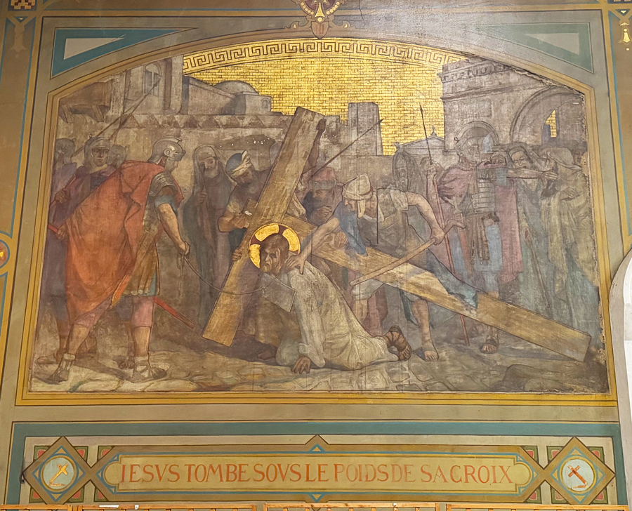 Cet article s’inscrit dans un vaste dossier : Via crucis, Via lucis Pour la première fois, Jésus tombe sous le poids de sa croix. Cet événement n’est pas relaté dans les évangiles. C’est l’une des cinq stations ajoutées par les Franciscains qui popularisèrent la pratique du Chemin de croix au XIVe siècle. [1] |