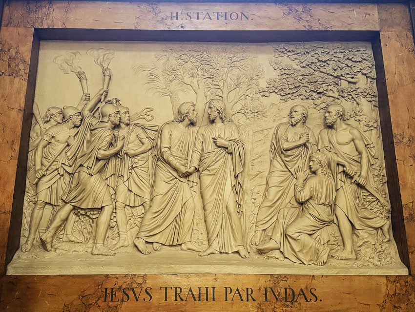 Après avoir prié au jardin des Oliviers, Jésus rejoint ses disciples restés à l’écart. Judas arrive accompagné de ceux qui vont l’arrêter. Cette étape de la Passion du Christ ne figure pas parmi les 14 stations couramment retenues pour le Chemin de croix pratiqué dans les églises catholiques le Vendredi saint. Voici les textes qui en font état.