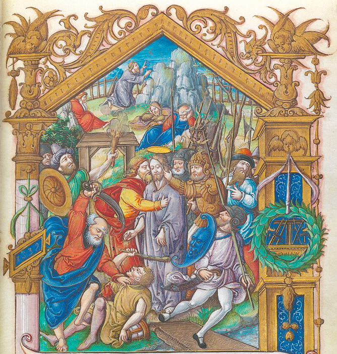 « Aussitôt, comme il parlait encore, survient Judas, l’un des Douze, et avec lui une bande armée d’épées et de bâtons, envoyée par les grands prêtres, par les scribes et par les anciens. Le traître était convenu avec eux de ce signe : "Celui que j’embrasserai, c’est lui ; arrêtez-le et emmenez-le avec précaution."