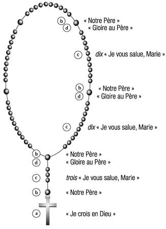 [1] "Ave Maria" est le nom latin de la prière "Je vous salue Marie". [2] "Credo" est le nom latin de la prière "Je crois en Dieu". [3] "Pater" est le nom latin de la prière "Notre Père". [4] "Gloria Patri" est le nom latin de la prière "Gloire au Père". [5] "Salve Regina" est le nom latin de la prière "Salut, Ô Reine". |