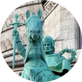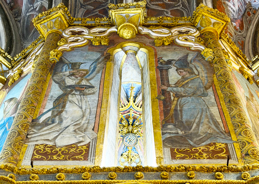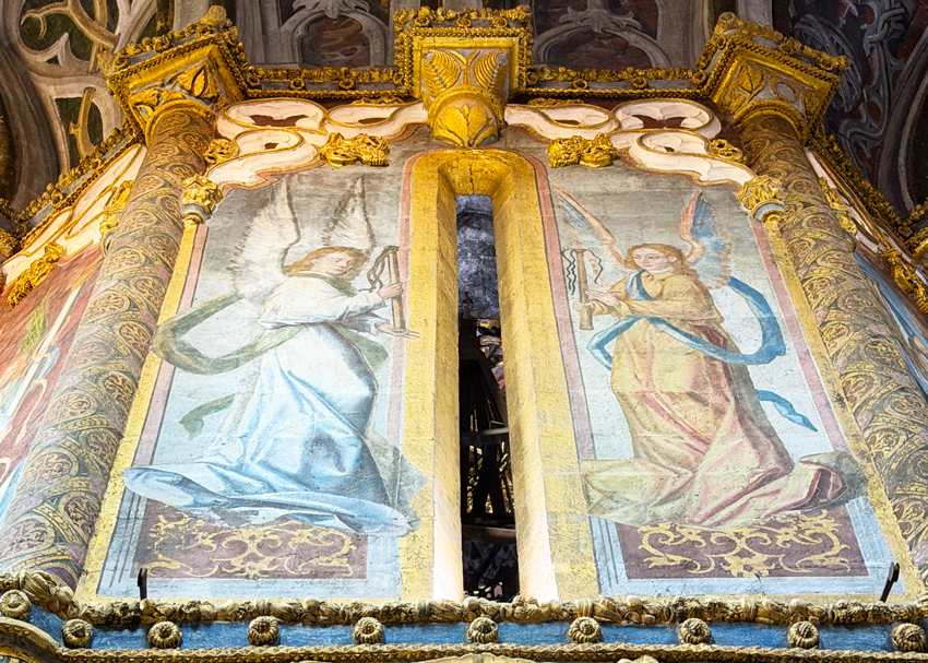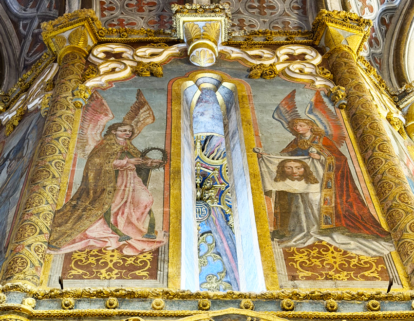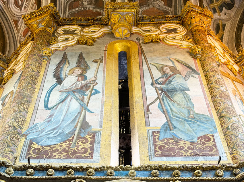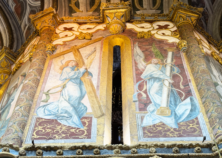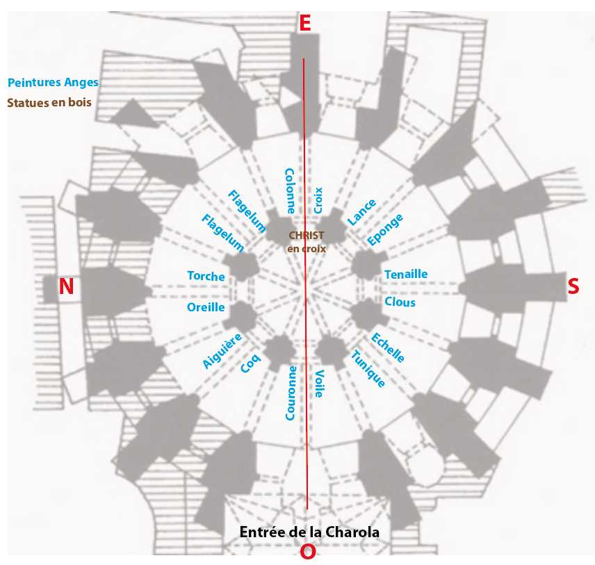 Cet article s’inscrit dans un vaste dossier : Via crucis, Via lucis Ces pages sur la Charola de la citadelle templière de Tomar sont une simple visite en images. A chacun de se laisser inspirer par ces visuels parfois surprenants. Ces seize anges portent les instruments de la Passion du Christ ou Arma Christi. A l’intérieur du tambour, on aperçoit le Christ en croix. Deux anges vêtus de riches manteaux tiennent la couronne d’épines et le voile de Véronique où s’est miraculeusement reproduit le visage du Christ. Textes des évangiles concernés : I - Jésus condamné à mort ; VI - Véronique essuie la face de Jésus A gauche, un ange vêtu de blanc porte l’aiguière et le plat qui ont servi à Pilate pour se laver les mains. A droite, un ange en bleu-gris tient une petite colonne surmontée du coq qui chanta lors du reniement de Pierre et une petite lampe. Textes des évangiles concernés : I - Jésus condamné à mort ; Reniement de Pierre A gauche, un ange en bleu clair et au manteau ocre brodé de perles tient une torche au long manche qui est allumée et une lanterne évoquant l’arrestation de Jésus. A droite, un ange vêtu de bleu azur et d’un manteau rose soutenu brodé de pierreries présente un glaive à la lame recourbée et l’oreille coupée par Pierre au jardin des Oliviers Textes des évangiles concernés : Arrestation de Jésus A gauche, un ange vêtu de blanc présente à deux mains un flagellum. A droite, un ange vêtu d’ocre rose et aux ailes multicolores tient un autre flagellum de la main gauche, le désignant de la main droite. Ces objets ont été utilisés lors de la flagellation du Christ. Textes des évangiles concernés : I - Jésus condamné à mort A gauche, un ange vêtu de bleu clair tient la croix qui a presque la forme d’un Tau dans un beau mouvement. A droite, un ange également vêtu de bleu clair regarde vers le haut. Il a une aile blanche et une aile verte. Il tient la colonne de la flagellation autour de laquelle s’enroule la corde ayant servi à attacher le Christ. Textes des évangiles concernés : Les 14 stations du Chemin de croix ; II - Jésus chargé de sa croix Sur ce plan de la Charola, où sont indiqués tous les instruments de la Passion, on distingue deux parties. De l’entrée jusqu’à l’Est en passant par le Nord, sont présentés tous les instruments de la Passion qui ont trait aux étapes qui précèdent la crucifixion. Etapes de la Via captivitatis que les pèlerins parcouraient à Jérusalem. De l’Est à l’Ouest en passant par le Sud, on peut voir tous les instruments de la Passion liés à la montée au Golgotha et à la crucifixion, soit dès que le Christ reçoit la croix : la Via dolorosa à Jérusalem qui donna naissance à la Via crucis ou Chemin de croix. S’il est difficile de trouver des documents antérieurs au XIXe siècle faisant mention de ces deux trajets parcourus par les pèlerins à Jérusalem, la preuve semble ici donnée en images que ces deux voies étaient connues et pratiquées dès le XVIe siècle au moins. A gauche, un ange vêtu de bleu clair tient à deux mains un long bâton fendu à son extrémité pour y fixer une éponge. A droite, un ange vêtu d’un bleu un peu plus soutenu tient de la main droite le manche d’une lance. Textes des évangiles concernés : Bientôt en ligne. A gauche, un ange vêtu de bleu azur, d’une étole et d’un riche manteau brodé présente de la main droite un vilebrequin et de la main gauche, protégés par un tissu blanc les trois clous de la crucifixion. L’ange de droite est vêtu de blanc, d’une étole dorée et d’un riche manteau ocre sur la bordure duquel sont représentés de nombreux personnages ; le revers de son manteau est de couleur verte. Il tient de sa main gauche le marteau et de la droite une paire de tenailles. Textes des évangiles concernés : Bientôt en ligne. A gauche, un ange vêtu de bleu azur tient à deux mains la tunique dont on distingue bien les manches. Il la présente comme si quelqu’un allait l’enfiler. A droite, un ange vêtu de blanc présente une échelle. Elle comporte six barreaux et donc cinq espaces. L’ange passe la tête par le quatrième espace en partant du bas. [1] Textes des évangiles concernés : Bientôt en ligne. Le tour du tambour de la Charola de Tomar s’achève en retrouvant le visage du Christ sur le voile de Véronique qui se trouve face à l’entrée. Remarques