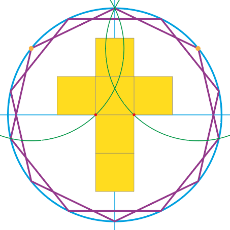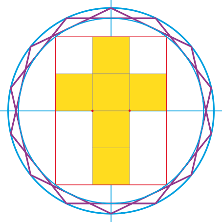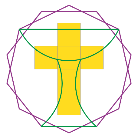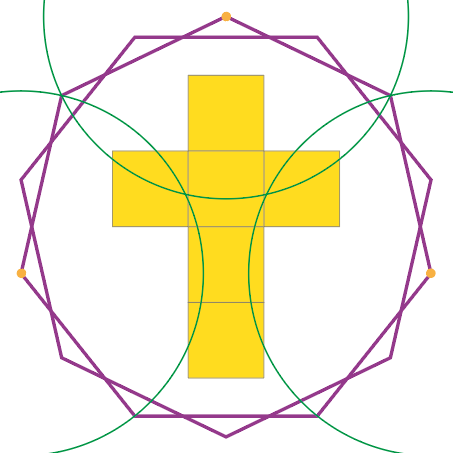 Cet article s’inscrit dans un vaste dossier : Via crucis, Via lucis Mais il existe tant de représentations des instruments de la Passion dans l’art de toutes les périodes ! Pourquoi aller chercher un compas pour dessiner en moins bien ce qui existe déjà ??? "Patience, répondit le géomètre, ce n’est pas pour un voyage artistique que nous partons ici, non ! Celui-ci est d’une tout autre nature..." Quatorze, c’est le nombre habituel de stations du Chemin de croix. Quatorze, en géométrie, c’est un polygone à 14 côtés qui se nomme tétradécagone. Quatorze, c’est encore 7 + 7. Et en géométrie, cela peut être aussi représenté par deux heptagones, c’est-à-dire deux polygones à 7 côtés chacun. Dessinons. Traçons d’abord un centre et un cercle parce que tout commence ainsi dans les récits anciens narrant la création du monde. Ajoutons deux axes pour les 4 directions de l’espace. Voilà, le décor est posé. Inscrivons maintenant deux heptagones dans le cercle. Entrelacés, les deux heptagones, semblent figurer la couronne d’épines qui est un élément central de la Passion du Christ. C’est pour cela que nous avons choisi ici de représenter le 14 de cette façon. Une couronne à 14 pointes, comme il y a 14 stations au Chemin de croix. Sans entrer dans les détails du tracé de l’heptagone, traçons deux arcs de cercle ayant pour rayon le côté d’un heptagone en pointant notre compas sur le cercle bleu aux points jaunes qui ont été marqués. Voici qu’apparaissent deux points rouges sur l’axe horizontal du cercle initial à la jonction des arcs de cercle. A partir du segment délimité par ces deux points, élevons un carré. Reproduisons ce carré à droite, à gauche, au-dessus et deux fois en-dessous. La croix vient d’apparaître. De la couronne à 14 pointes, géométriquement elle est issue. Six carrés la composent. Poursuivons... Entourons la croix d’un rectangle - notons au passage qu’il est de proportion 3 sur 4 et que la croix composée de six carrés laisse libres six autres carrés "blancs" à l’intérieur du rectangle. La croix occupe donc la moitié de la surface de ce rectangle. Faut-il chercher un sens à cette exacte complémentarité ? Mais ce rectangle ne touche pas la couronne ? Pourquoi l’avoir dessiné ? C’est le cercle contigu au rectangle qui en est la clé. Car ce cercle est parfaitement inscrit dans les heptagones. Plus de doute, il y a assurément parenté géométrique entre la couronne et la croix. Couronne d’épines et croix : nous avons là deux instruments de la Passion associés au sang et à la souffrance. Mais... l’histoire n’est pas finie... Poursuivons et avançons encore... Traçons maintenant trois nouveaux arcs de cercles de même dimension que les premiers. Un autre symbole de l’histoire du Christ se révèle sous nos yeux. Une coupe apparaît. Un troisième symbole, lui aussi associé au sang. La légende raconte en effet que Joseph d’Arimathie aurait recueilli le sang du Christ lors de la crucifixion. Que la coupe qu’il avait en main était celle que Jésus avait utilisée lors du dernier repas. Que cette coupe aurait ensuite été préservée puis cachée. Que les chevaliers de la Table ronde l’auraient nommée Graal en partant à sa recherche. Est-ce cette coupe qui vient d’apparaître devant nous ? Laissons chacun à sa contemplation. De son côté, le géomètre l’assure : la couronne, la croix et la coupe sont naturellement liés par la règle et le compas. |