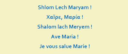 "Shlom Lech Maryam" en araméen ; "Kaïre Maria" en grec ; "Shalom lach Meryem" en hébreu ; "Ave Maria" en latin ; "Je vous salue Marie" en français. Les illustrations proviennent du site : https://ar.pinterest.com/pin/759419555897501116/ |
